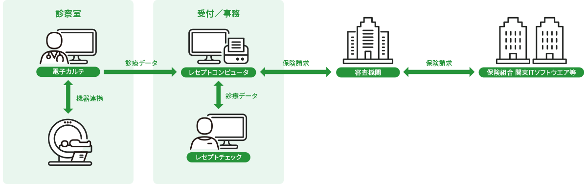 各業務で医療機器や外部システムとの連携を行いながら、診療所における基幹システムとして導入してもらう。