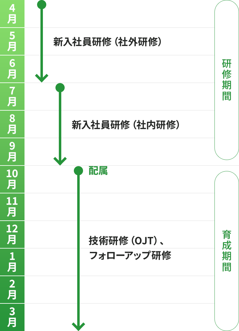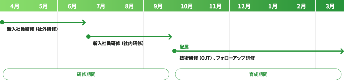 uisは研修期間6カ月、育成期間6カ月として1年間新入社員の成長をサポートします。
